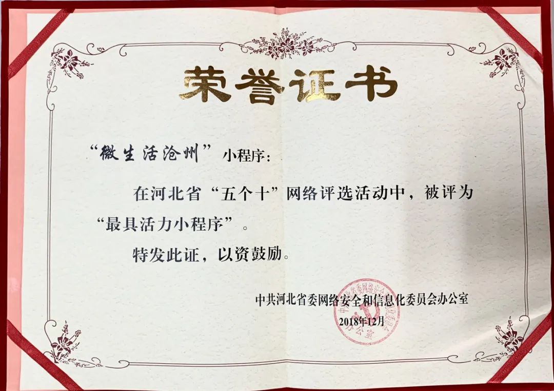 自2017年11月上線以來(lái),得到了廣大網(wǎng)友的認(rèn)可和關(guān)注,在團(tuán)隊(duì)的精心運(yùn)營(yíng)下,于2018年12月份榮獲由中共河北省委網(wǎng)信辦主辦、河北廣播電視臺(tái)新媒體中心承辦,在全省范圍內(nèi)挖掘好網(wǎng)絡(luò)文化產(chǎn)品、選樹正能量網(wǎng)絡(luò)人物、傳播正面主流聲音,為新時(shí)代建設(shè)經(jīng)濟(jì)強(qiáng)省美麗河北凝聚強(qiáng)大網(wǎng)絡(luò)正能量的《河北省“五個(gè)十”網(wǎng)絡(luò)評(píng)選》中“最具活力小程序”榮譽(yù)。于2019年7月份榮獲由中共滄州市委網(wǎng)信辦和滄州市網(wǎng)絡(luò)媒體協(xié)會(huì)共同頒發(fā)的“滄州市2018年度優(yōu)秀新媒體(自媒體)信息傳播平臺(tái)”榮譽(yù)證書。